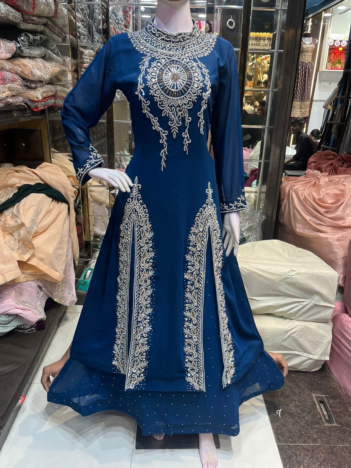Indulge in timeless elegance with this exquisite navy blue Anarkali suit, designed to captivate at any special occasion. Crafted from lightweight, flowing georgette fabric, the long kurta features full sleeves and a high neckline adorned with intricate silver embroidery, shimmering beadwork, and sequin accents that cascade from the ornate circular motif at the chest down the front slits for a regal touch. The flared silhouette offers a graceful drape, paired with matching bottoms for a complete ensemble. Ideal for weddings, festivals, or evening gatherings, this piece combines traditional Indian craftsmanship with modern comfort, ensuring you stand out with sophistication and poise. Available in standard sizes; dry clean recommended to preserve the delicate detailing.
